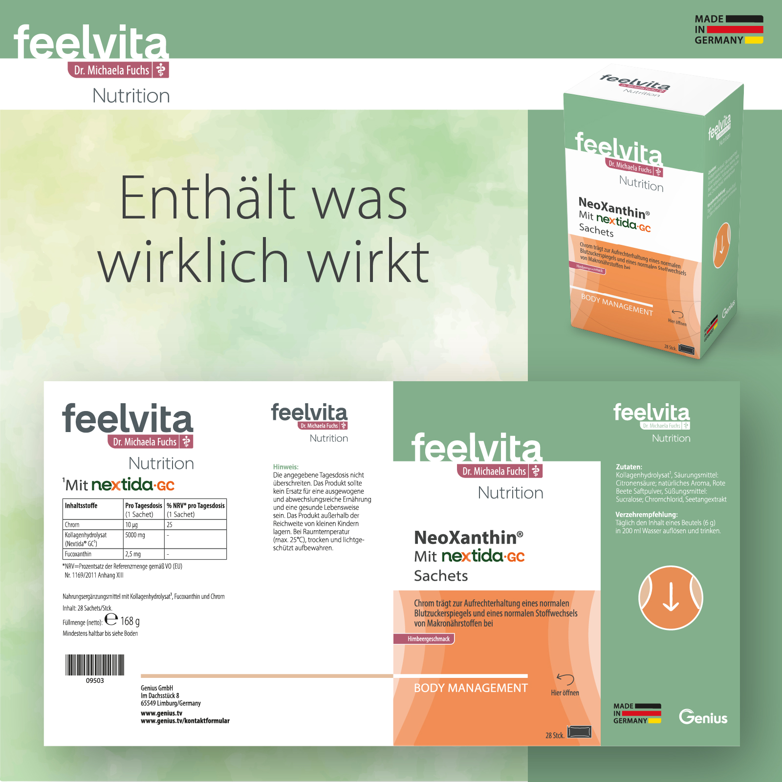 NeoXanthin von Feelvita Nutrition ist ein Nahrungsergänzungsmittel mit ausgewählten Inhaltsstoffen wie Kollagenhydrolysat, Fucoxanthin und Chrom. Die Zusammensetzung wurde entwickelt, um eine bewusste Ernährung sinnvoll zu ergänzen und den Körper mit wichtigen Nährstoffen zu versorgen.